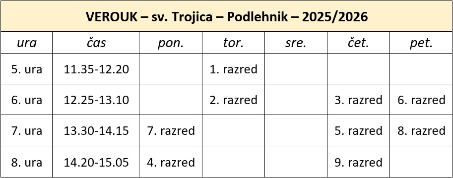 - šolsko vodstvo se je zopet zavzelo in že pripravilo urnik verouka za novo šolsko-veroučno leto; za to se jim iskreno zahvaljujemo. Novi veroučni urnik je priložen.